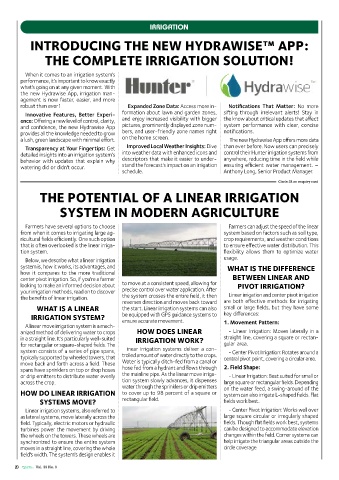 or drip emitters to distribute water evenly the mainline pipe. As the linear move irriga- - Linear Irrigation: Best suited for small or